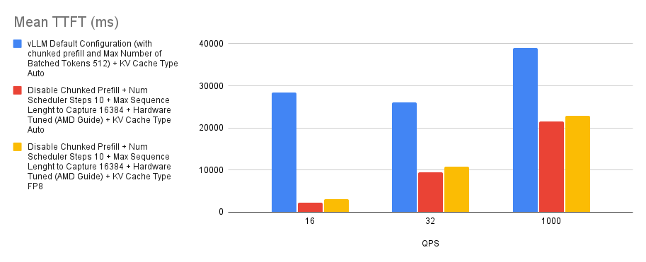 Based on the experiment we ran, we found that there’s a slight improvement with tuning the chunked prefill values over disabling the chunked prefill feature. However, if you’re not sure whether to enable chunked prefill or not, simply start off by disabling it and you should generally expect better performance than with using the default settings. This is specific to MI300X GPUs.